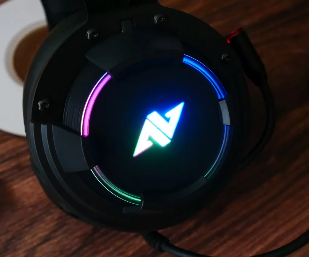 Чашки выполнены из пластика, они сложной формы, и вдобавок оснащены неуправляемой RGB подсветкой, которая питается от USB, для чего на конце кабеля есть соответствующий штекер. Если на правой чашке нет ничего интересного, то на левой находится и аналоговый регулятор громкости (сзади) и микрофон на гибкой ножке (спереди).