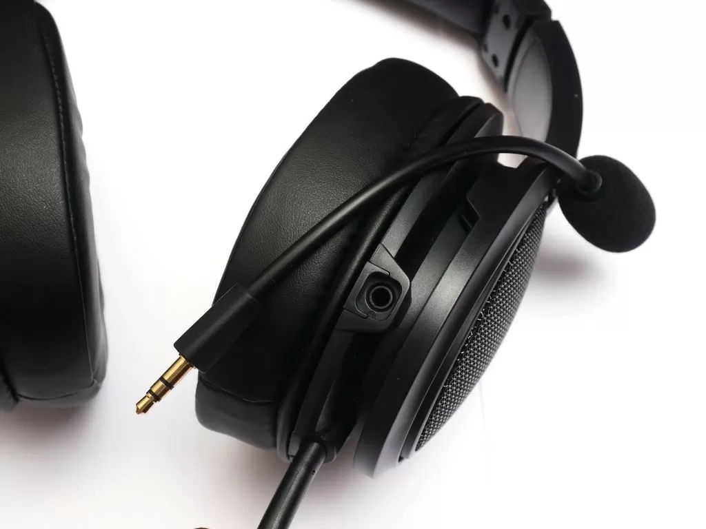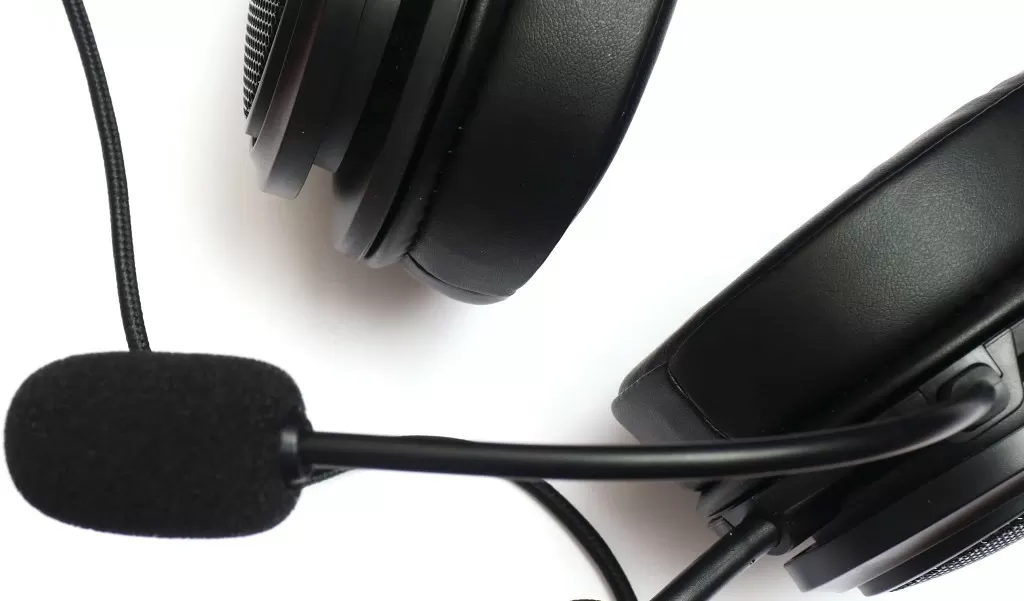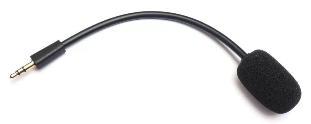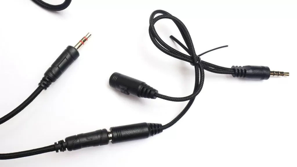 Из левой чашки выходит аудиокабель в тканевой оплётке, тут же находится аудиопорт для подключения комплектного съёмного микрофона. Он выполнен на гибкой ножке, так что его положение в пространстве можно скорректировать. Плюс есть стандартная ветрозащита.
