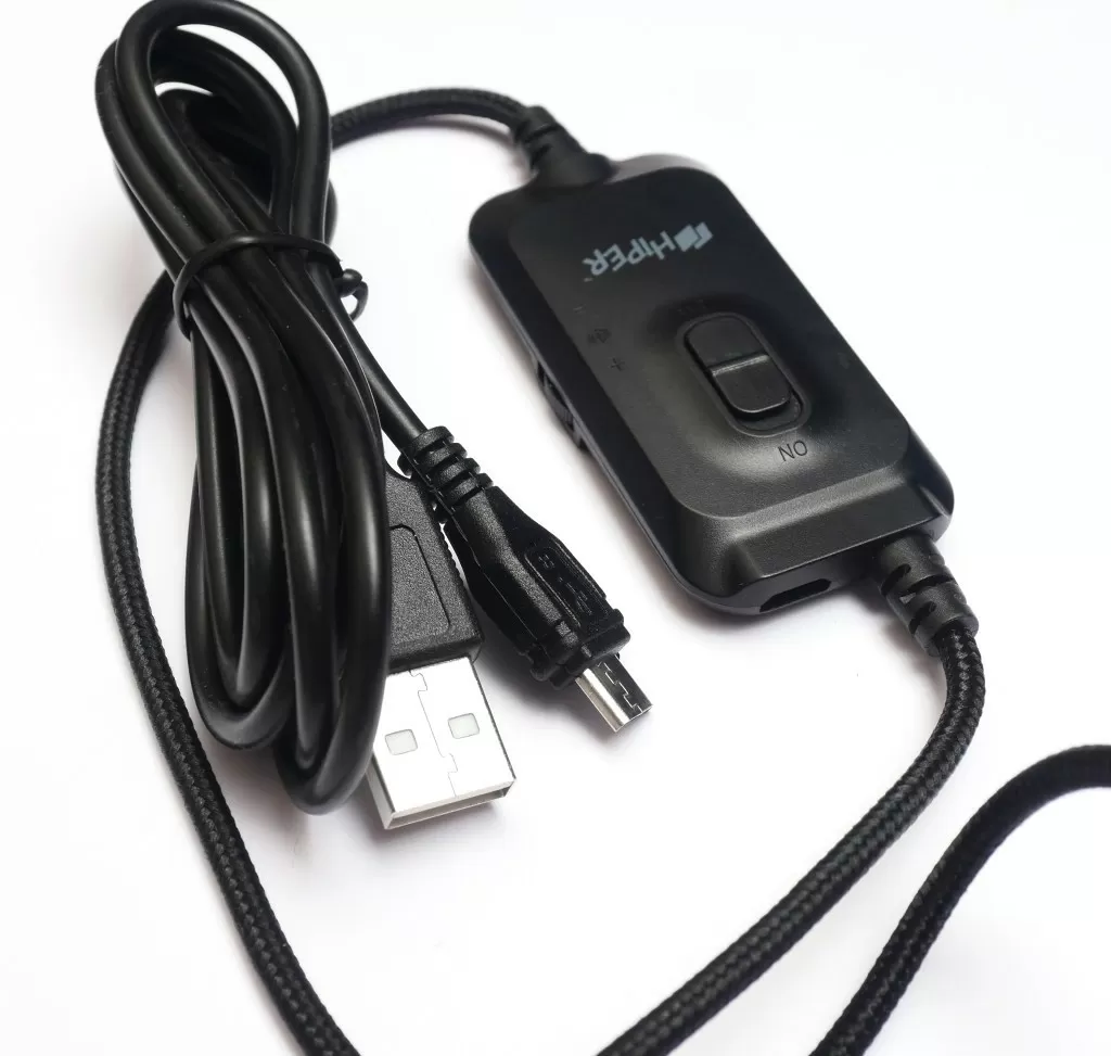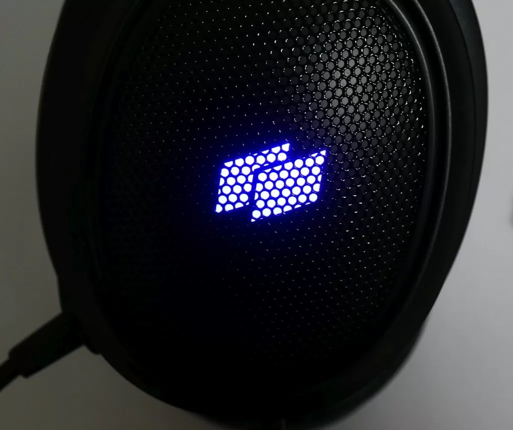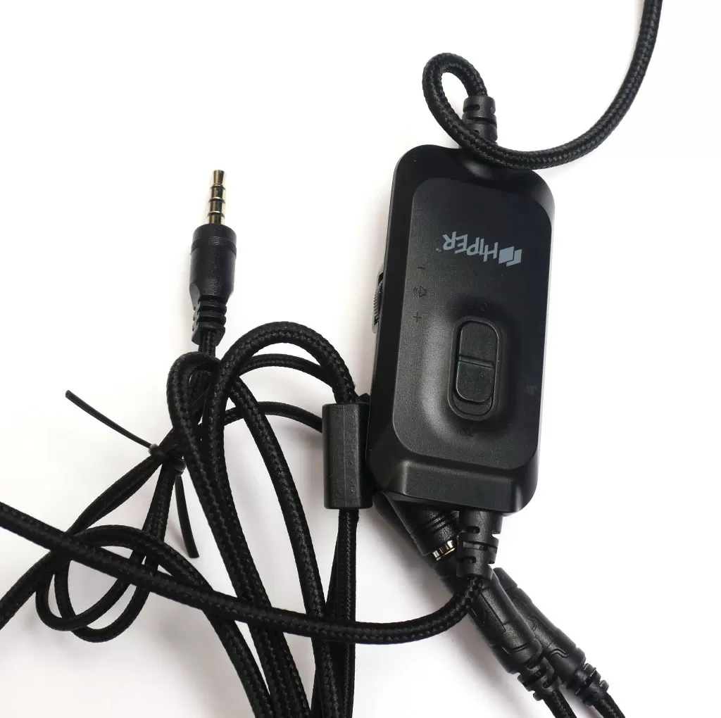 На кабеле на расстоянии около метра от наушников располагается пульт, на нём есть выключатель микрофона и регулятор громкости. На конце кабеля – два 3,5 мм аудиоразъёма для раздельного подключения наушников и микрофона, плюс в комплекте есть переходник на четырёхпиновый разъём для подключения гарнитуры к ноутбуку, смартфону или игровой приставке. А ещё на пульте управления есть порт microUSB, который отвечает за питание простенькой подсветки, что скрывается за металлической сеткой на чашках. Просто подсвечивается лого бренда фиолетовым цветом, нет ни регулировки яркости, ни каких-то режимов работы. При желании, USB кабель можно просто не подключать, и подсветка не будет гореть.