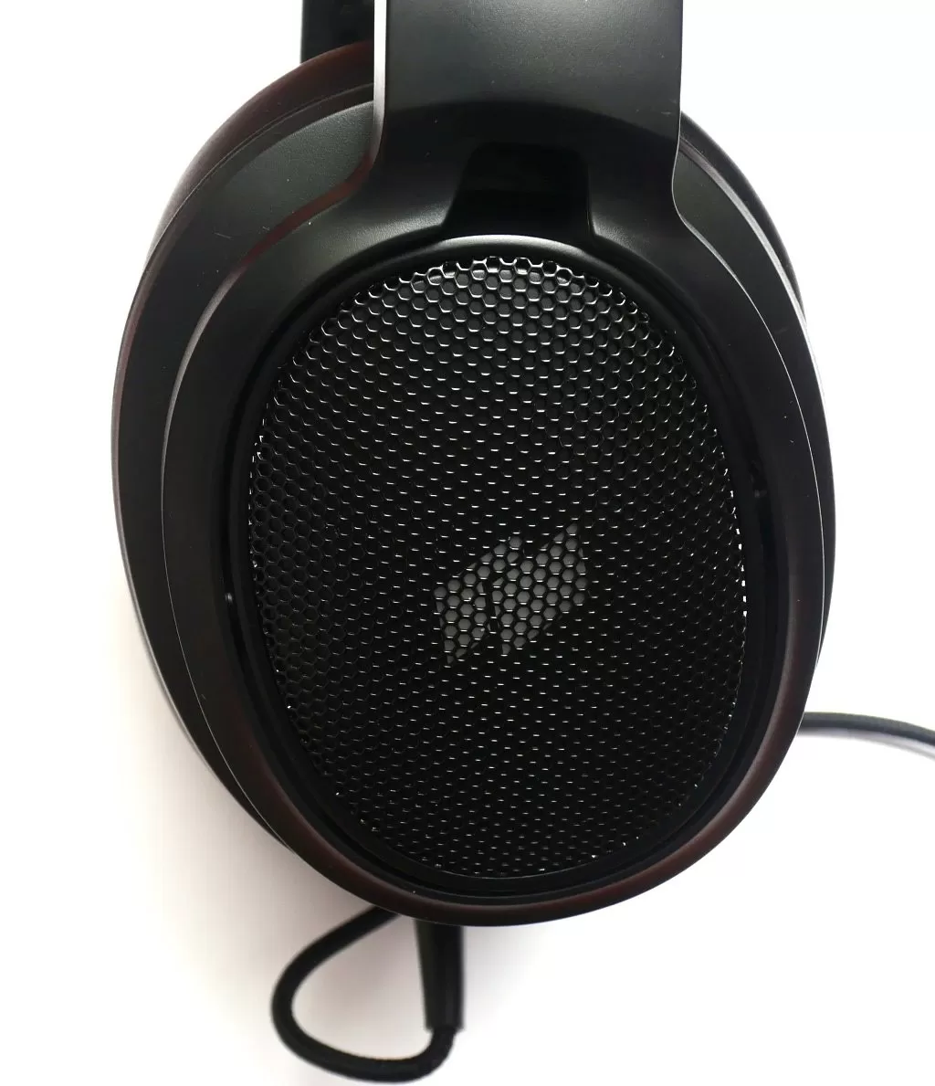 Гарнитура крупная, полноразмерная, накладная. Корпус целиком выполнен из пластика. Из металла – лишь сетка на чашках. Оголовье – с ручной регулировкой, на нём есть большая подушка с наполнителем средней мягкости и кожзамовым покрытием. Амбушюры тоже покрыты кожзамом. Уши охватываются полностью, прижим обеспечивается очень неплохой, но наполнитель амбушюр успешно распределяет давление на голову. Чашки имеют регулируемый угол относительно оголовья, так что посадка – комфортная.