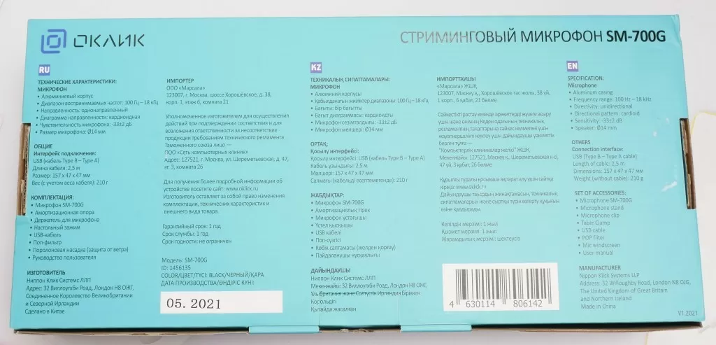 Появление на рынке Оклик SM-700G на самом деле событие очень приятное. Доступных конденсаторных микрофонов сейчас не так много, да и в основном выбор сводится к китайским моделям. Теперь же есть отличный вариант от отечественного бренда – с богатой комплектацией, USB интерфейсом, хорошим звуком и самое приятное – по очень адекватной цене.