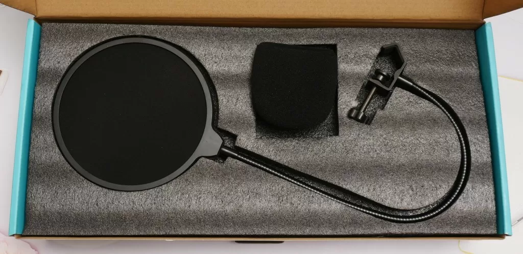 Микрофон поставляется в крупной картонной упаковке, в которой содержимое плотно упаковано на двух «этажах». Сверху – круглый поп-фильтр на гибкой ножке и поролоновая насадка (она же ветрозащита). Снизу – сам микрофон, USB-кабель длиной 2,5 метра, стойка, крепление к столу (профессиональное название – «пантограф») и подвес для микрофона.