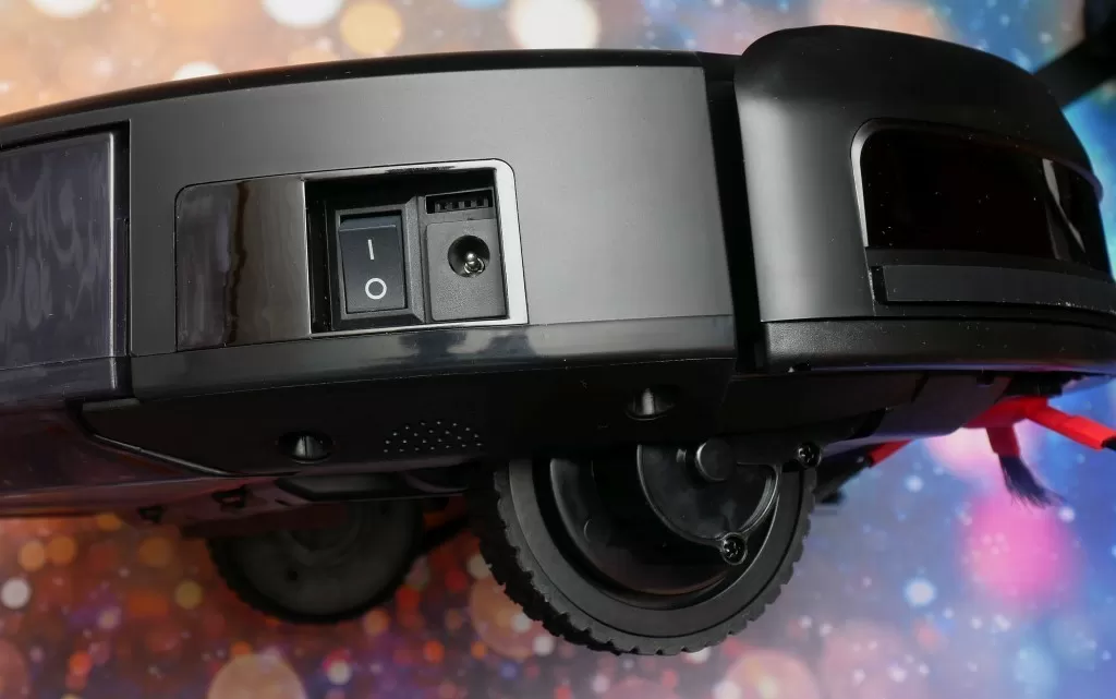 Теперь глянем на сам пылесос. Верхняя крышка – очень стильная. Это глянцевый пластик, который выглядит как стекло. Остальная часть корпуса – чёрная как уголь. Габариты - 31,5 см в диаметре и 7,9 см в высоту. Вес составляет 2,1 кг. Пылесос невысокий, а так как на верхней крышке нет ничего выступающего (лидара то нет, а кнопка включения выступает совсем немного), то пылесосу будет легко проезжать под разными предметами и мебелью. По устройству всё вполне стандартно – спереди находится бампер, сбоку – тумблер питания, а вот верхняя крышка – несъёмная, контейнер устанавливается сзади, но о нём капельку позже.