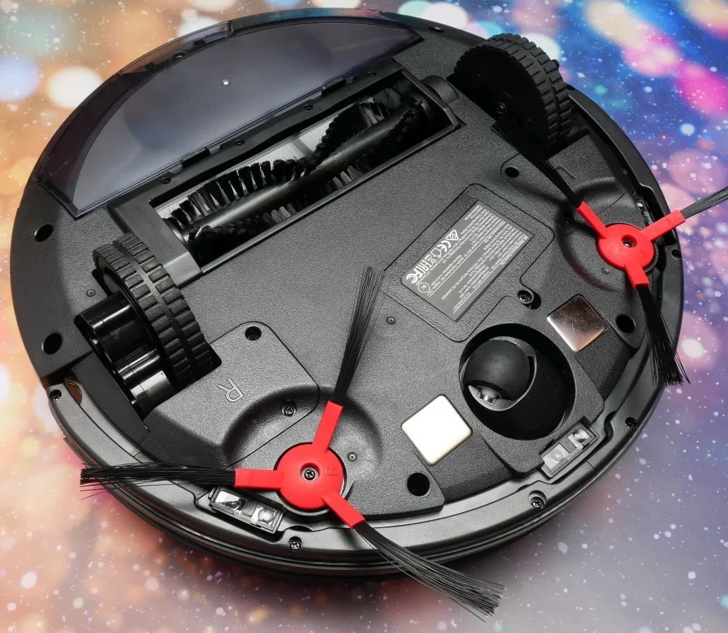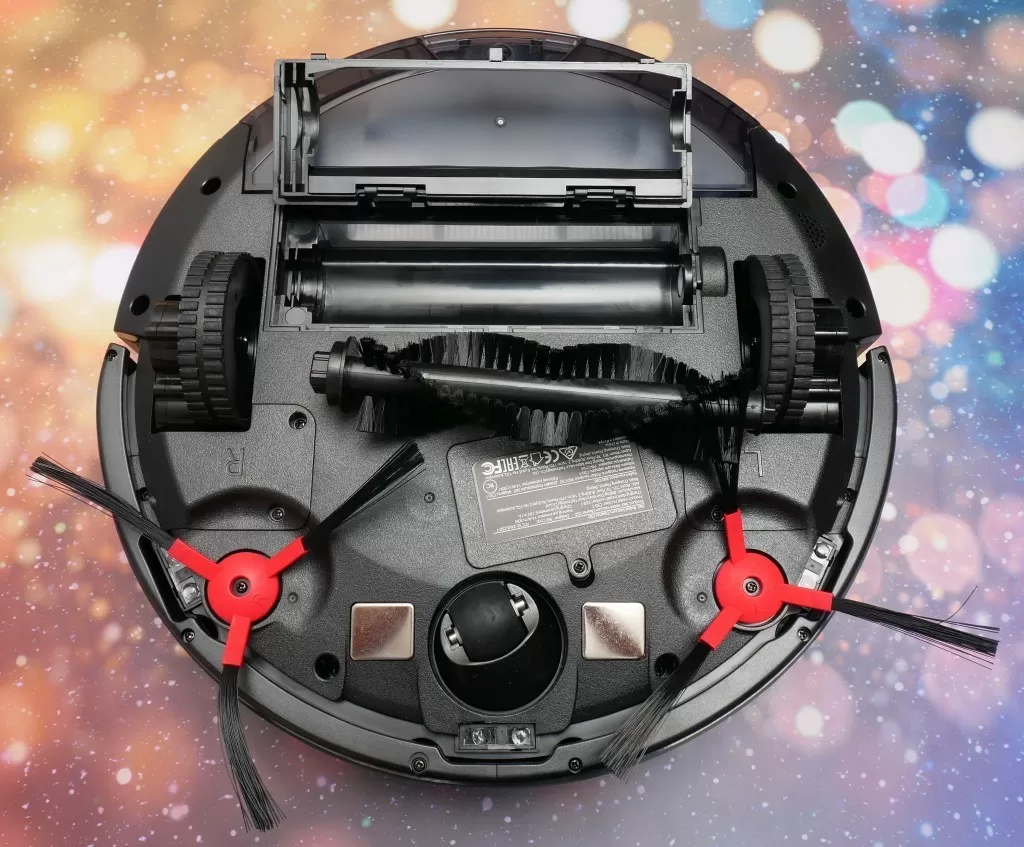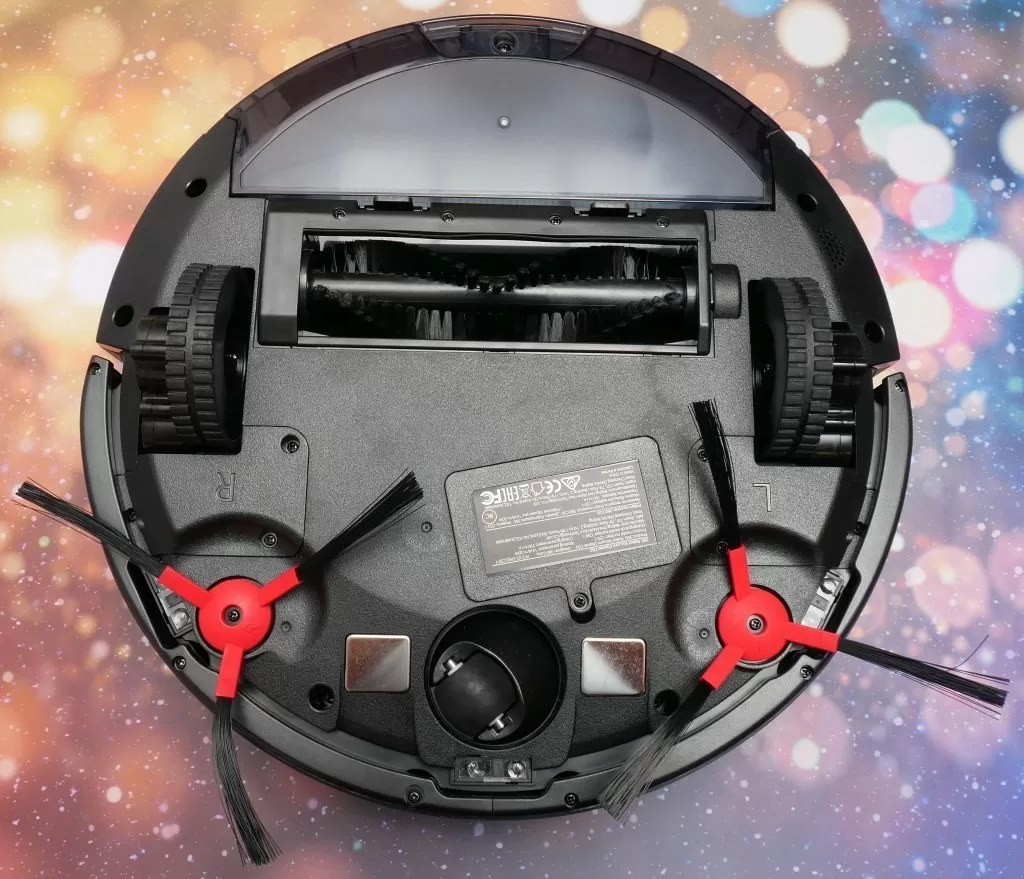 Посмотрим на пылесос снизу. Боковых щёток две штуки, причём они зафиксированы маленькими саморезами. Жаль, что в комплекте нет запасных. Есть датчики высоты, чтобы пылесос не падал с высоты. Турбощётка простая, с одним рядом мягкого ворса. Конечно же она извлекается для чистки (вспоминаем про комплектный инструмент для ухода).