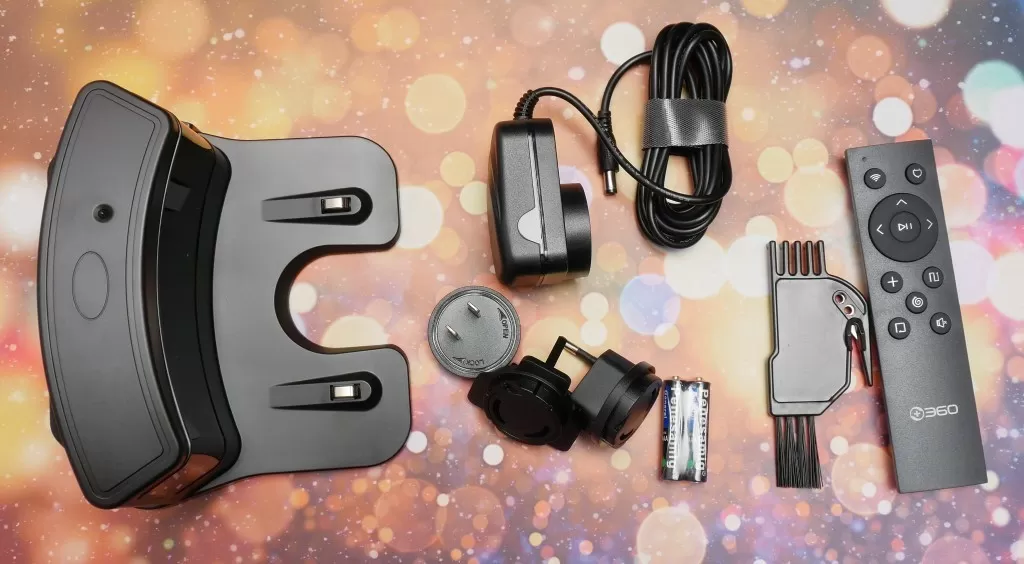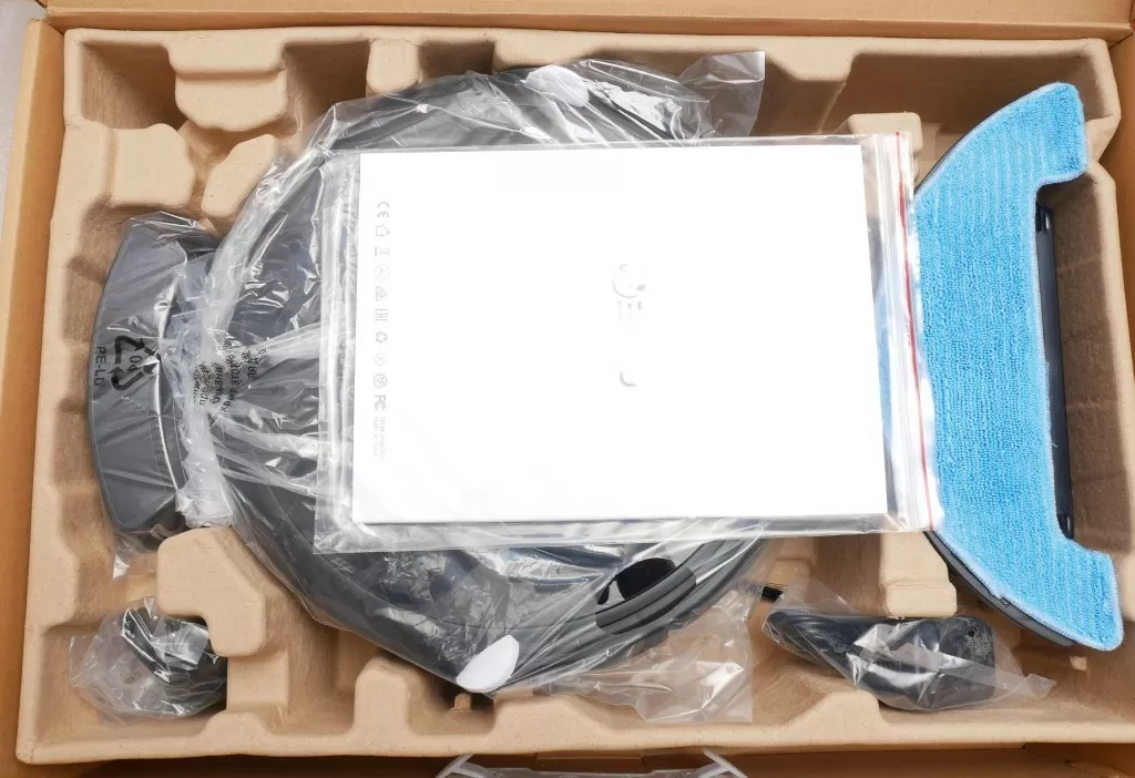 Устройство поставляется в картонной коробке с минимальным оформлением и вполне привычными для данной категории габаритами. Комплектация стандартная: вместе с самим пылесосом мы получает контейнер для влажной уборки (с одной тряпкой), базовую станцию, сетевой блок питания с тремя вилками для разных типов розеток, пульт управления с комплектом батареек, а также инструмент для ухода за пылесосом и макулатура.
