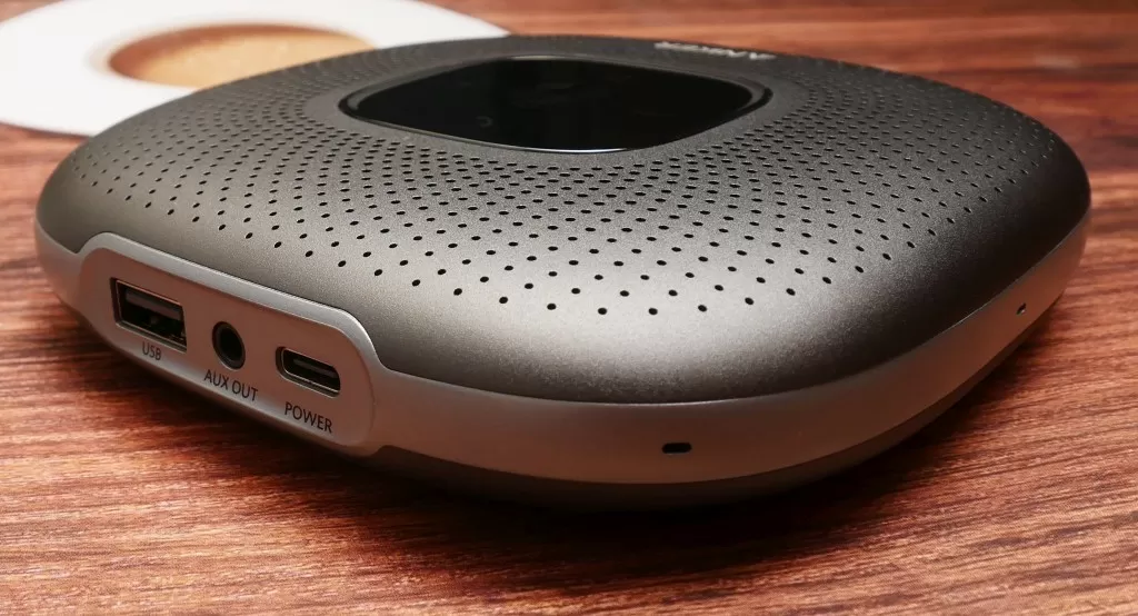 По другую сторону от пары кнопок находятся порт Type-C для зарядки и подключения к компьютеру, AUX аудиовыход для подключения внешних колонок и полноценный USB порт для зарядки гаджетов. Сразу скажем про автономность – от встроенного аккумулятора ёмкостью 6700 мАч спикерфон работает до 24 часов в режиме разговора. Это значит, что, если вы тратите 3-4 часа в день на разговоры, заряжать устройство придётся не чаще чем раз в неделю. При этом гаджет может выступать и в роли powerbank, заряжая от USB-A порта смартфоны, планшеты, или любые другие устройства с ограничением по току 2.1 А (то есть выходная мощность равна 10,5 Вт, используется фирменная технология Anker PowerIQ). Заряжается спикерфон током 2 А, на полную зарядку уходит около 4-5 часов.