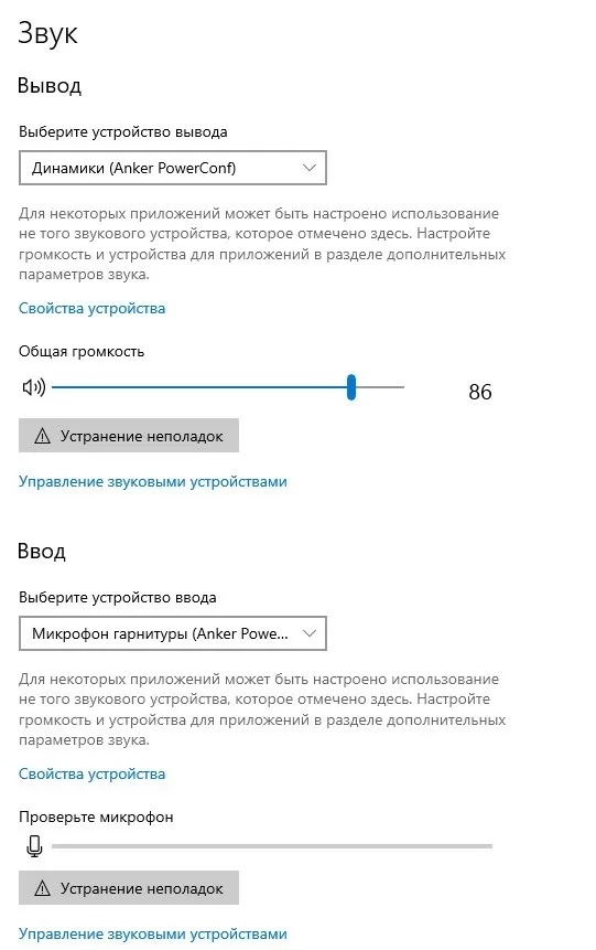 Как мы уже говорили выше, устройство можно подключать и по Bluetooth и по USB. Во втором случае на компьютер не требуется установка драйверов – устройство определяется автоматически и видится в системе и как источник звука, и как микрофон. Это позволяет использовать Anker PowerConf и для вызовов со смартфона и для общения через Skype и другие аудио/видео мессенджеры.