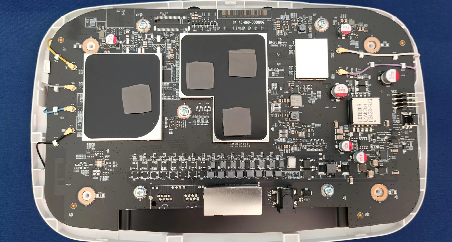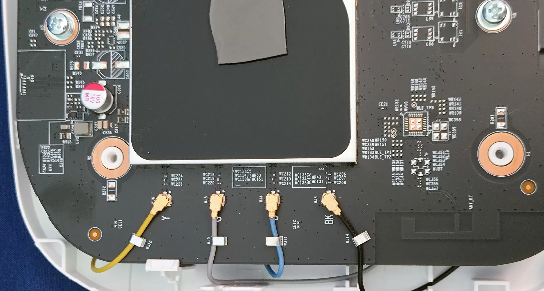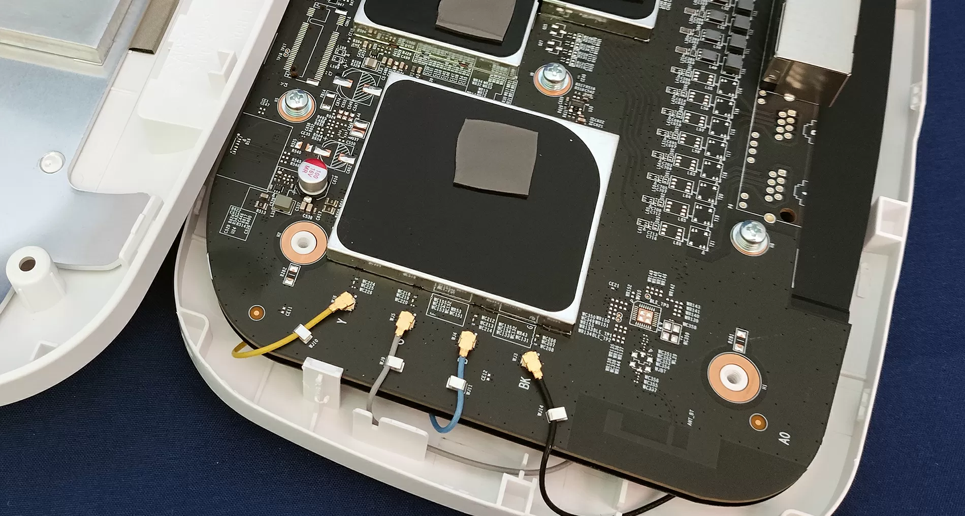 Судя по размещению радиоустройств внутри, понятно, почему у WBE530 такой необычный вытянутый корпус. На центральной части платы установлен процессор с оперативной памятью. Слева от него — модуль Wi-Fi 5/6 ГГц, справа — модуль 2.4 ГГц. Каждый компонент, включая процессор и радиоблоки, обёрнут в отдельный экранированный «кокон». Такой дизайн обусловлен желанием конструкторов сделать так, чтобы радиомодули находились максимально далеко друг от друга. При этом их аналоговые цепи и цифровые узлы расположены на противоположных сторонах платы. Правда, столь аккуратное внимание к помехозащите заставляет задуматься: почему тогда производитель не использовал экранированные кабели для соединения антенн, ведь это могло бы дополнительно усилить защиту.