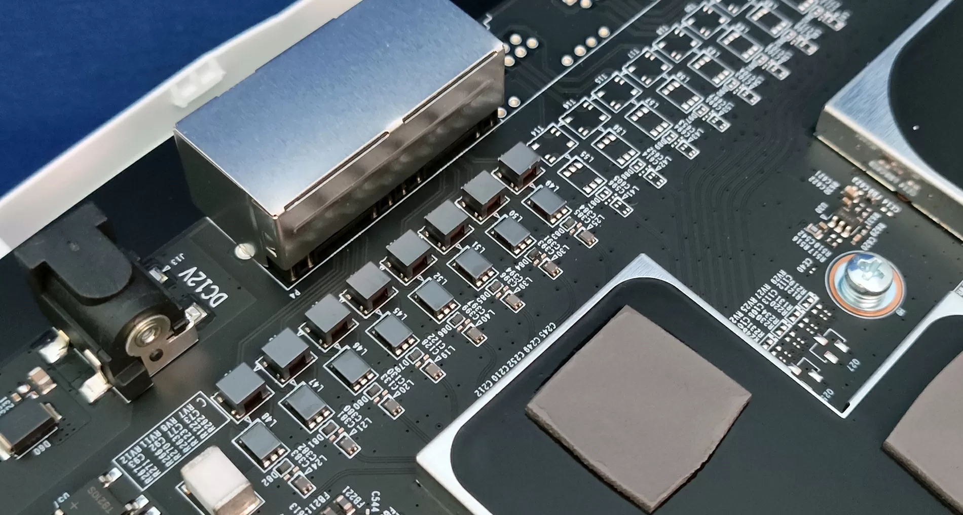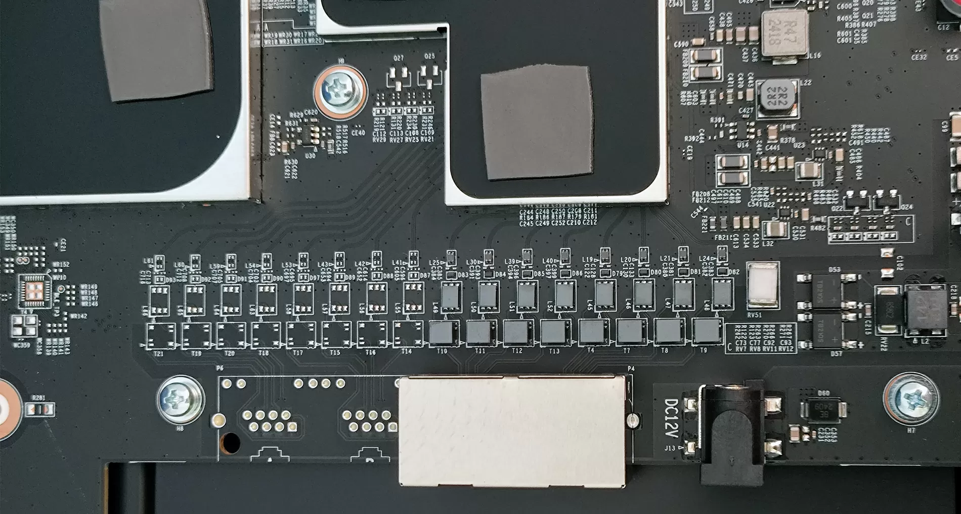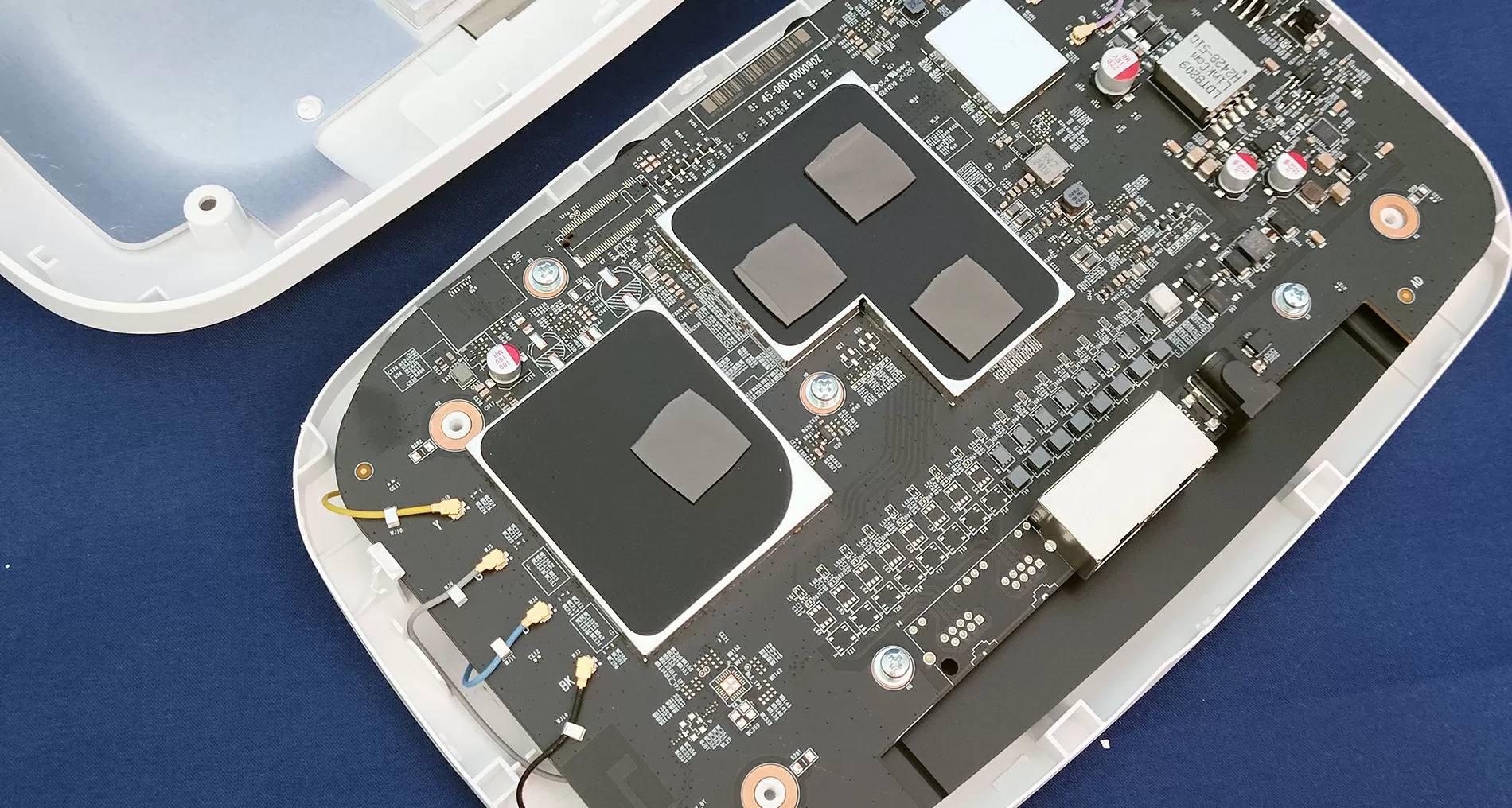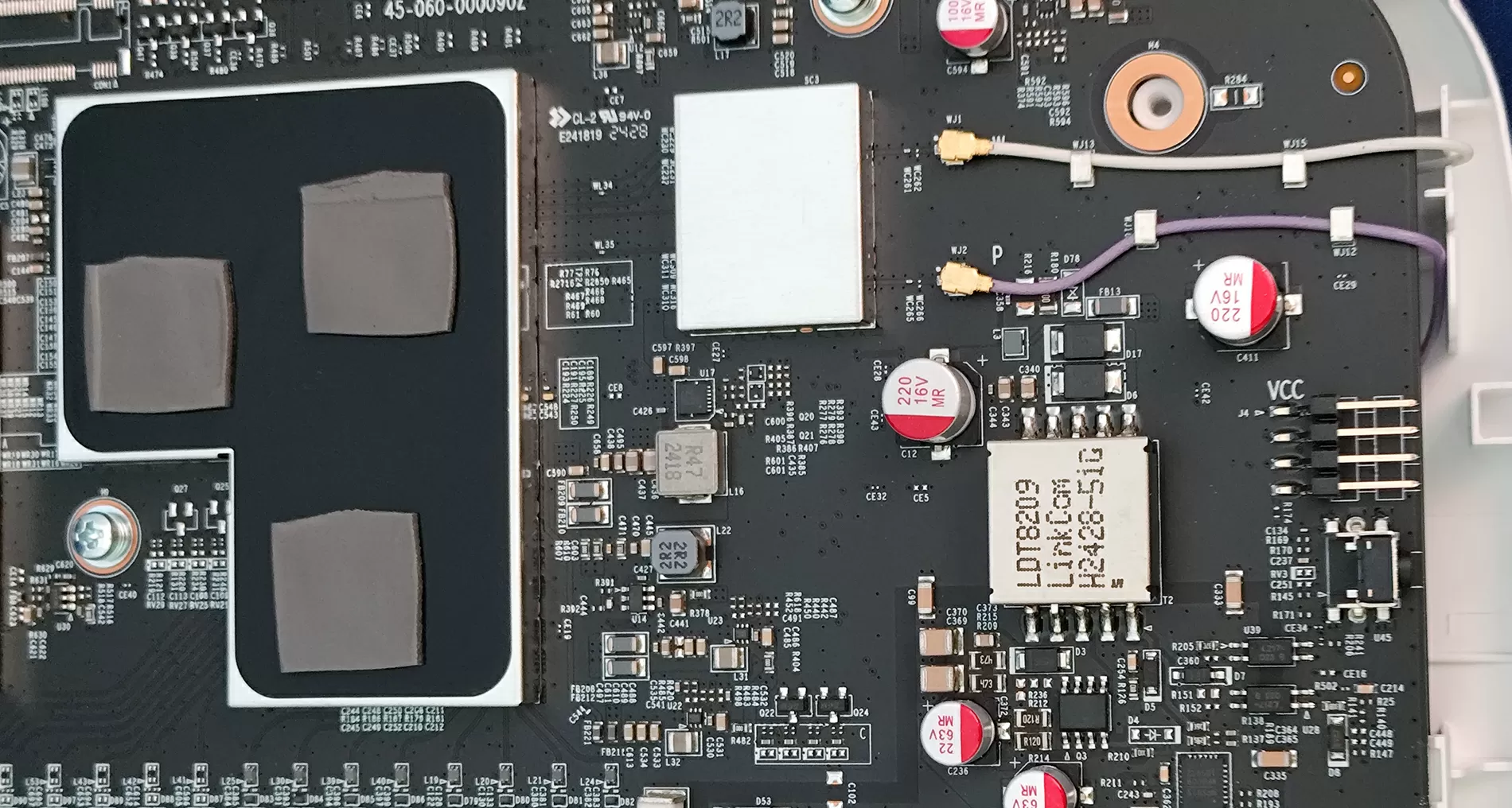 Судя по размещению радиоустройств внутри, понятно, почему у WBE530 такой необычный вытянутый корпус. На центральной части платы установлен процессор с оперативной памятью. Слева от него — модуль Wi-Fi 5/6 ГГц, справа — модуль 2.4 ГГц. Каждый компонент, включая процессор и радиоблоки, обёрнут в отдельный экранированный «кокон». Такой дизайн обусловлен желанием конструкторов сделать так, чтобы радиомодули находились максимально далеко друг от друга. При этом их аналоговые цепи и цифровые узлы расположены на противоположных сторонах платы. Правда, столь аккуратное внимание к помехозащите заставляет задуматься: почему тогда производитель не использовал экранированные кабели для соединения антенн, ведь это могло бы дополнительно усилить защиту.