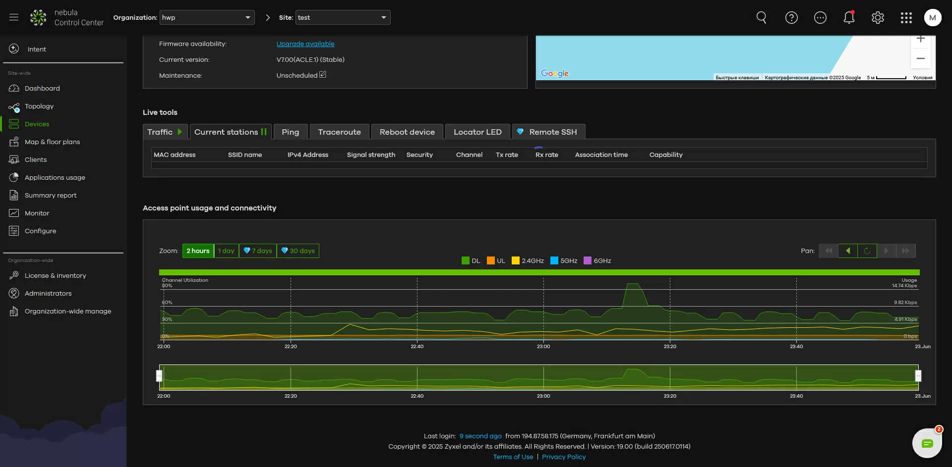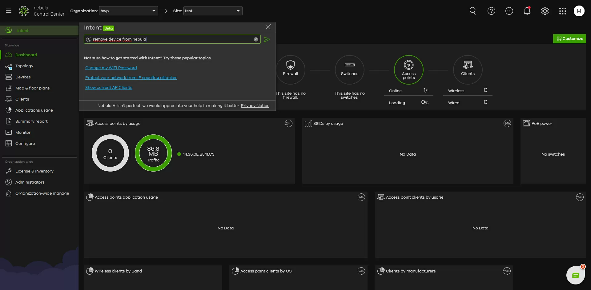 Точки доступа NWA210BE поддерживают два способа настройки: локальное управление через командную строку (CLI) или веб-панель, а также централизованное администрирование с помощью облачной системы Nebula Control Center. Ранее мы уже подробно описывали возможности этой платформы, поэтому просто уточним, что в интерфейс был внедрён AI-чат, который дополняет простой поиск по документации. Его главное преимущество — адаптация под оборудование Zyxel, благодаря чему он эффективно решает задачи управления, не сталкиваясь с ограничениями.