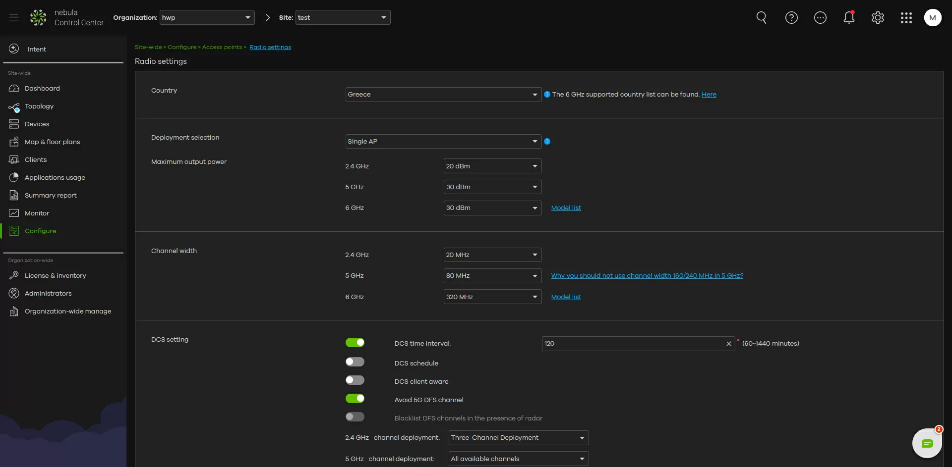 Для включения работы в диапазоне 6 ГГц необходимо в настройках Wi-Fi сменить значение "Страна" на Грецию, Тайвань или Польшу. Ширина радиочастотного канала (40, 80, 160 или 320 МГц) задаётся по усмотрению администратора отдельно для каждой точки доступа и каждого используемого диапазона частот.