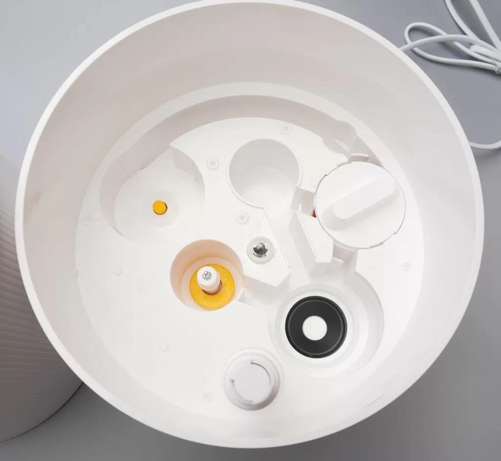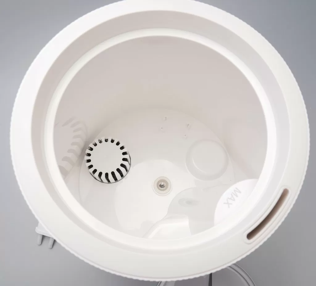 Ну и пройдёмся по потребительским качествам. Заявленная максимальная производительность – 270 мл/час, мощность – 25 Вт, уровень шума – 34 дБ. На деле же увлажнитель не шумный, на уровне своих конкурентов. Ёмкости контейнера хватит приблизительно на сутки непрерывной работы на полной мощности – это плюс. Чисто теоретически из слабых мест можно обозначить лишь протекание ёмкости, из-за открытой конструкции.