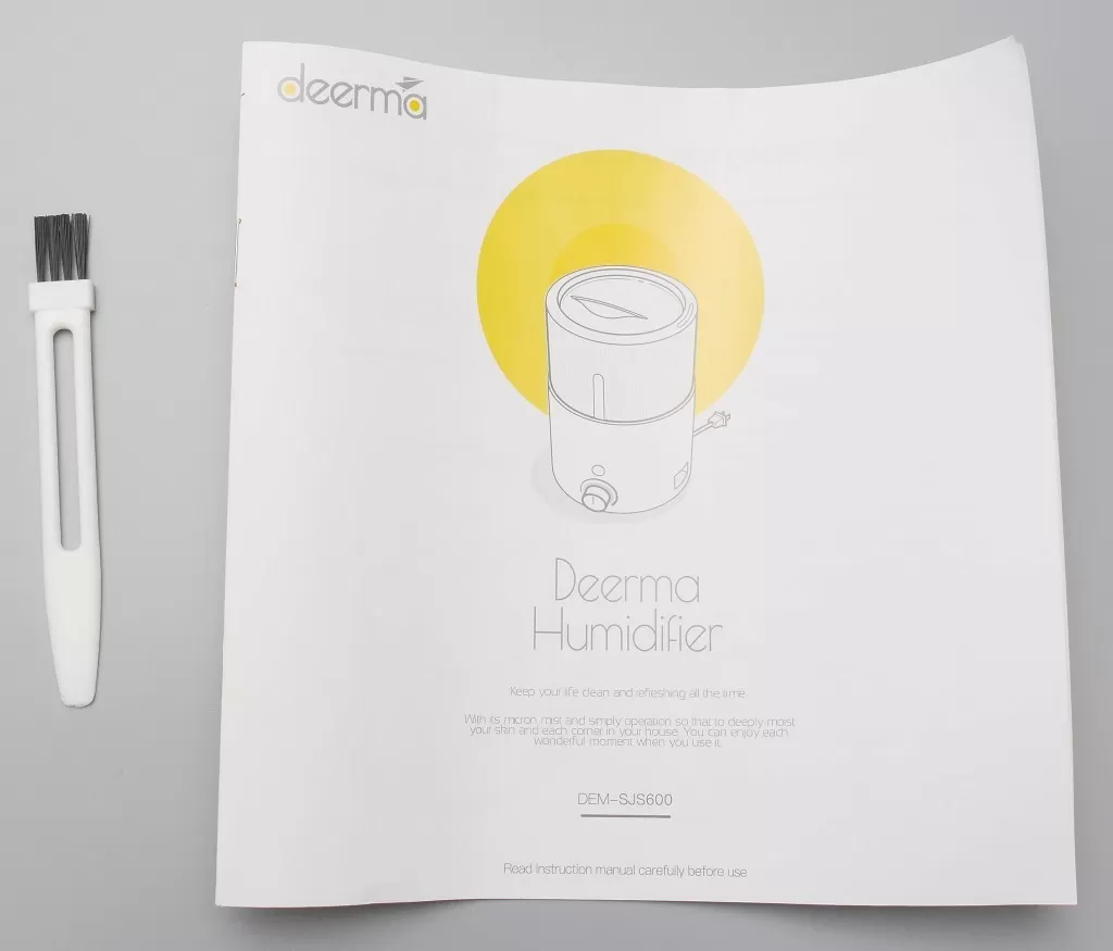Увлажнитель поставляется в крупной картонной упаковке, из которой также извлекается руководство пользователя и кисточка для очистки.