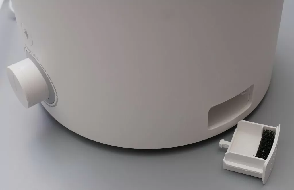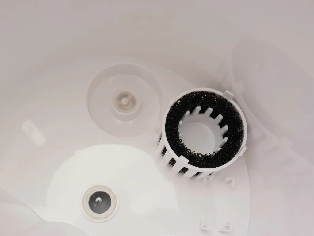Контейнер имеет внушительную ёмкость – целых 5 литров, и видимо в том числе и поэтому залив воды организован без его извлечения – верхняя крышка съёмная, но её даже не обязательно снимать, чтобы залить воды. Она имеет специальную форму и прорезь, в которую очень легко наливать воду сверху. Рядом с крышкой располагается прорезь, из которой выходит пар. Очень жаль, что направление потока никак не регулируется. Если снять крышку, то нашему взору предстанет съёмный фильтр грубой очистки.