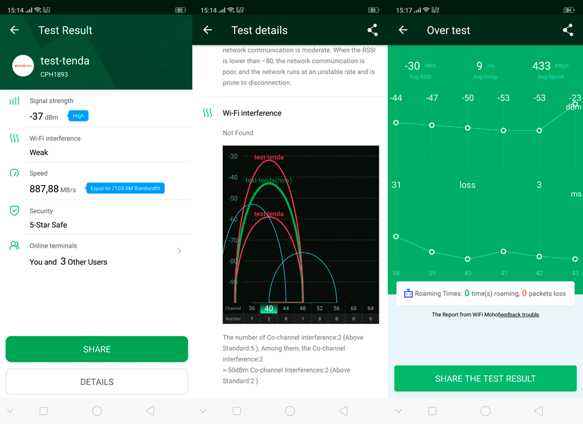 Если вы строите Wi-Fi для клиентов, посетителей и IoT (умных вещей), то возможностей беспроводного канала будет достаточно. Точки доступа настраиваются через простое мобильное приложение, и для добавления новых достаточно сфотографировать QR-код на донышке хот-спотов. Если вы любите общаться по видеосвязи или голосом через мессенджеры, перемещаясь по офису, то обязательно включите функцию бесшовного роуминга, чтобы ваш телефон всегда подключался к точке доступа с наилучшим сигналом, а сам момент переключения происходил мгновенно, без потери пакетов. Результаты тестирования беспроводной сети с бесшовным роумингом вы можете увидеть на скриншотах ниже: