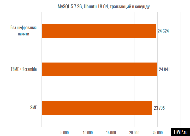 Скажем так: я искал разницу в производительности в приложениях, интенсивно использующих ОЗУ, и не нашёл её. Небольшие различия в показателях можно смело списать на погрешность измерений, так что если вы устанавливаете выделенный сервер для базы данных, будь то NoSQL кэш или SQL база, то шифрование ОЗУ скорость не украдёт. Есть исследования, показывающие, что снижение скорости растёт с увеличением датасета. Я проводил тест MySQL с базой данных объемом 2.7 Гб (12 миллионов записей) и аналогично не заметил влияние TSME на скорость. Вообще, учитывая конфигурацию процессора EPYC 7551p (32 ядра по 2 ГГц), он больше подходит не для сервера под одно приложение, а для облака!