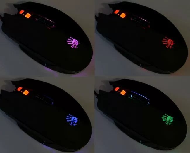 Прорывается она через лейбл Bloody на спинке мышки, а также по периметру через щель между верхней и нижней частями корпуса. Режима работы три – быстрое переливание разных цветов, медленное дыхание и статический цвет. Причём как выбрать цвет в двух последних режимах нам разобраться не удалось. Также подсветку можно полностью отключить. Скролл также подсвечивается, но цвет зависит от выбранного значения чувствительности сенсора.