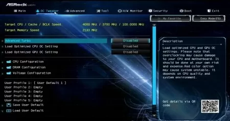 BIOS ASRock Z370 Extreme4 также вполне себе стандартен с учётом используемого чипсета Z370, и функционал полностью соответствует текущим требования и моде. На месте – разгон процессора с возможностью тонкой настройки в том числе и режимов работы ОЗУ, а также ключевых напряжений системы.