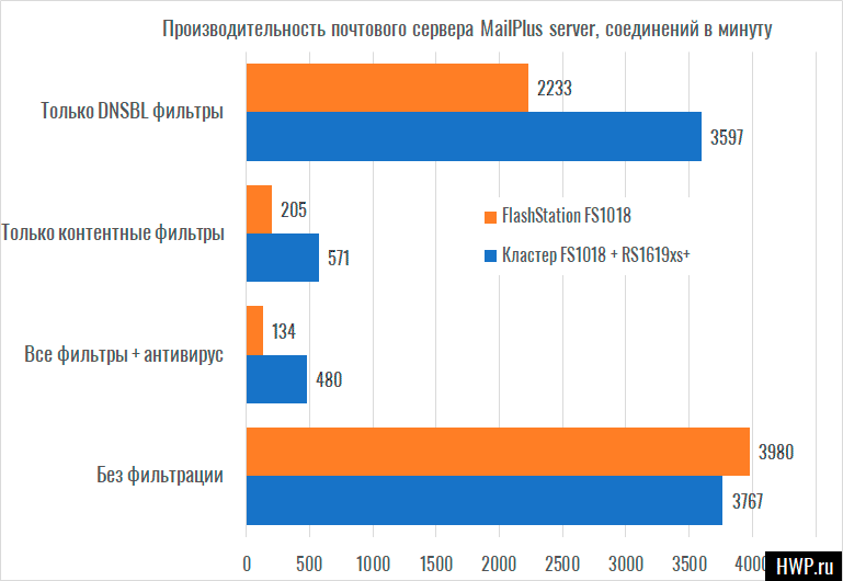 Как видите, сильнее всего на производительность почтового кластера влияют фильтры безопасности, и конечно же, RackStation RS1619xs+ вытягивает производительность всего кластера за счёт своего более мощного процессора. Но без фильтрации, когда роль CPU не так важна, уже мы начинаем упираться в синхронизацию между двумя машинами и скорость дисковой системы, поэтому в данном режиме одна FlashStation FS1018 работает быстрее.