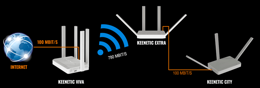 В крайнем случае, вместо City можно взять Air и быть уверенным, что там скорости 5-гигагерцового канала хватит, но мы еще попробуем другой подход: подключим City к Extra по проводу, как показано на рисунке. Уж дюже Keenetic гордится этим достижением, постоянно подчёркивая, что у конкурентов такую сеть собрать непросто.