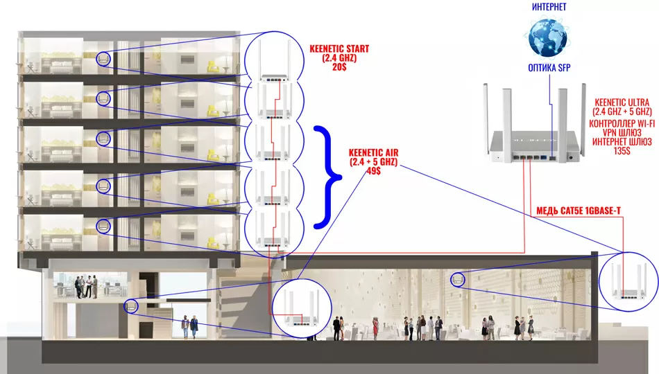 Основные преимущества такой сети мы уже расписали: это простота, взаимозаменяемость и дешевизна, а недостаток, с нашей точки зрения, только один: отсутствие поддержки PoE, так что каждый хот-спот придётся располагать возле электрической розетки. В принципе, учитывая, что стандарт 2.4 ГГц никуда не уходит и даже не собирается, при ограниченном бюджете можно вообще строить всю сеть на 20-долларовых Keenetic Start, а 5 ГГц размещать только в конференц-залах или холлах. Никакого смысла выбирать для хот-спотов модели с USB-портами нет, так что смотрите на Keenetic Air (49$) или Keenetic Start (20$).